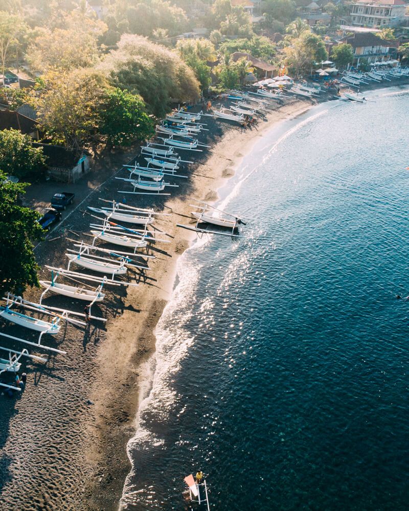 Amed, en el noreste de Bali, ofrece una de las versiones más tranquilas y especiales de la isla, con una costa llena de encanto, playas de arena negra volcánica y un ambiente pausado junto al mar. Conocido por sus fondos marinos, su esencia relajada y su carácter menos masificado, es perfecto para quienes buscan una Bali costera más auténtica, serena y cercana a la vida local.